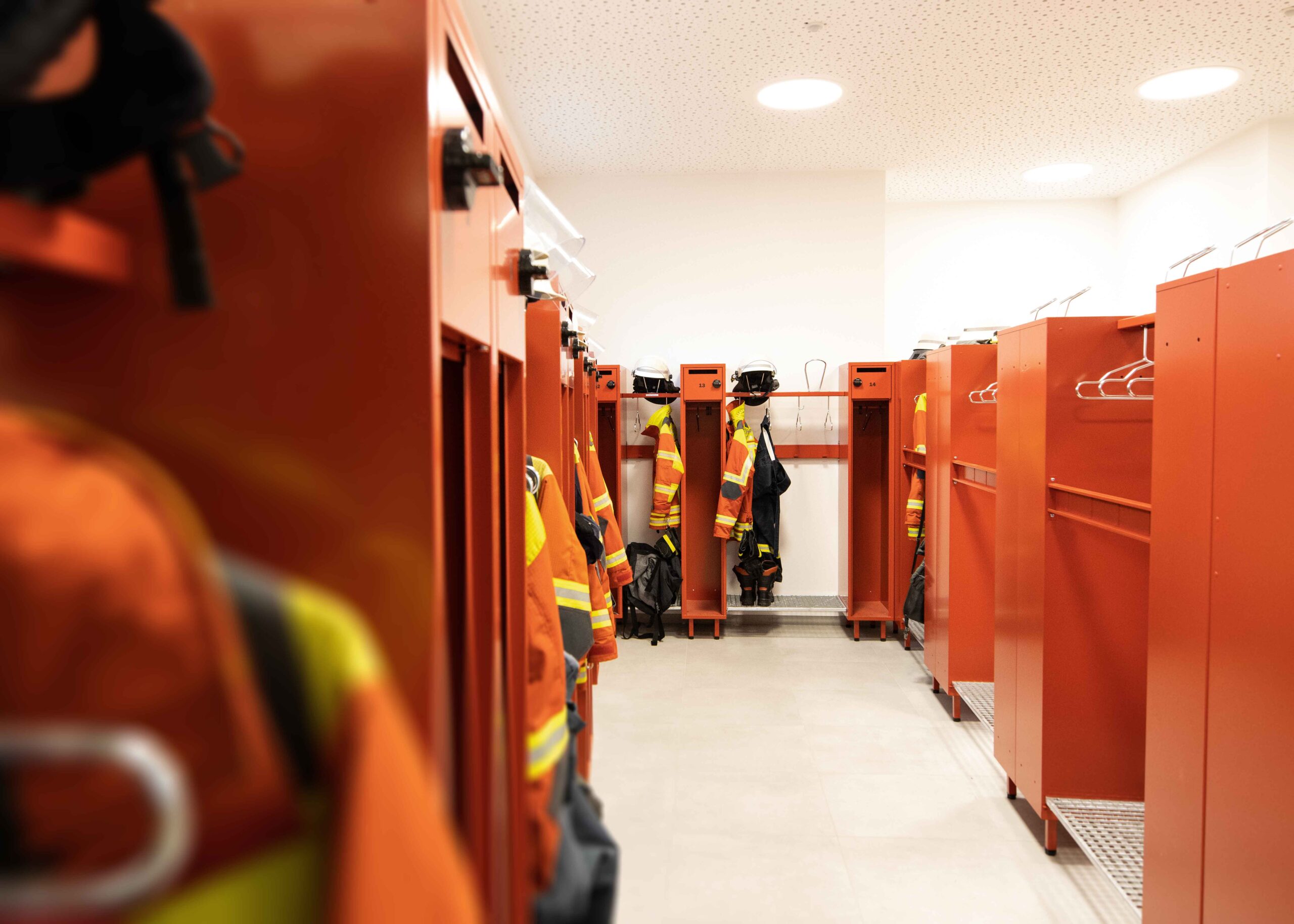 Im Fokus der Maßnahme standen eine funktionale Neuordnung der Räume, zusätzliche Lagerflächen sowie moderne Umkleide- und Sanitärbereiche. Besonderes Augenmerk galt der Schwarz-Weiß-Trennung zur Trennung von kontaminierter Einsatzkleidung und sauberem Bereich – ein zentraler Beitrag zum Gesundheitsschutz der Einsatzkräfte.